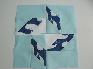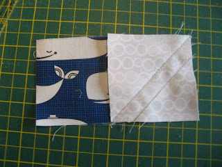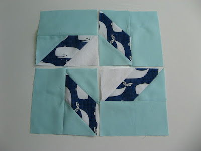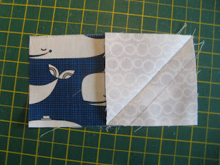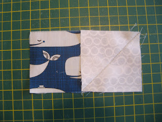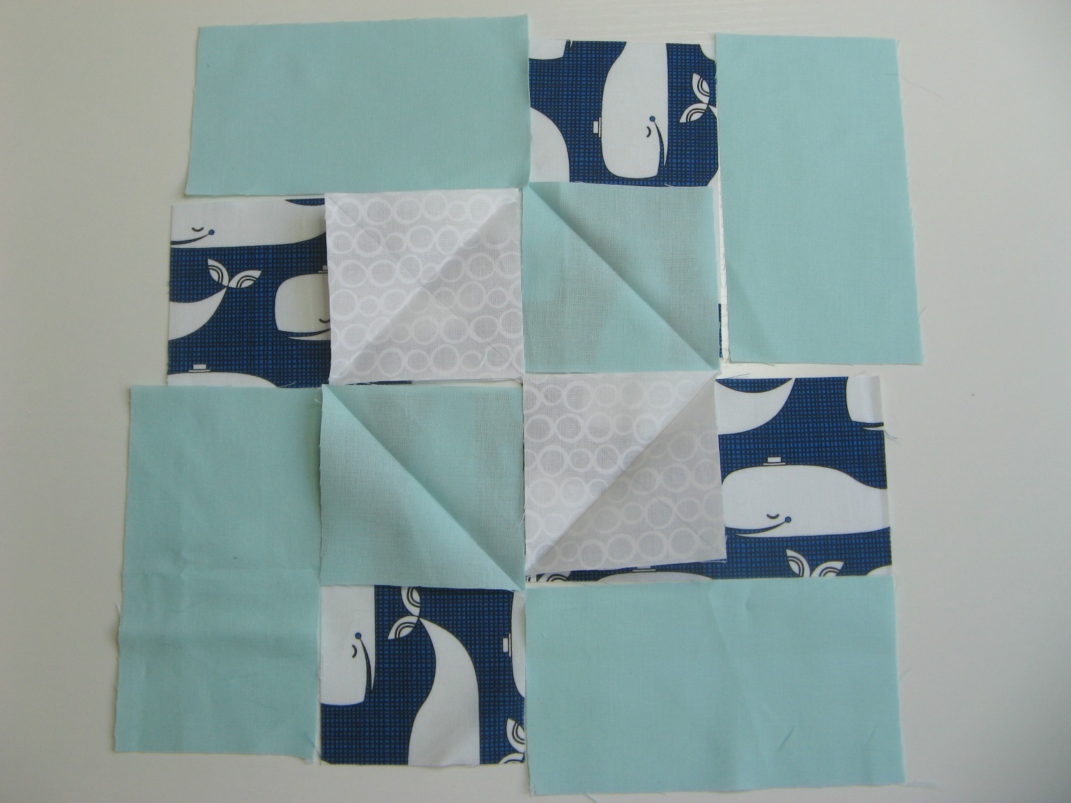 Make one more unit with a white square and feature fabric rectangle; and two more with background coloured squares and your feature fabric rectangles.
