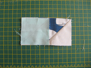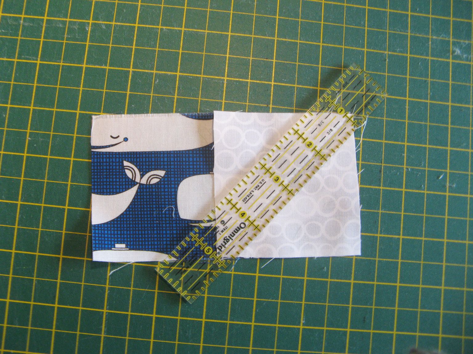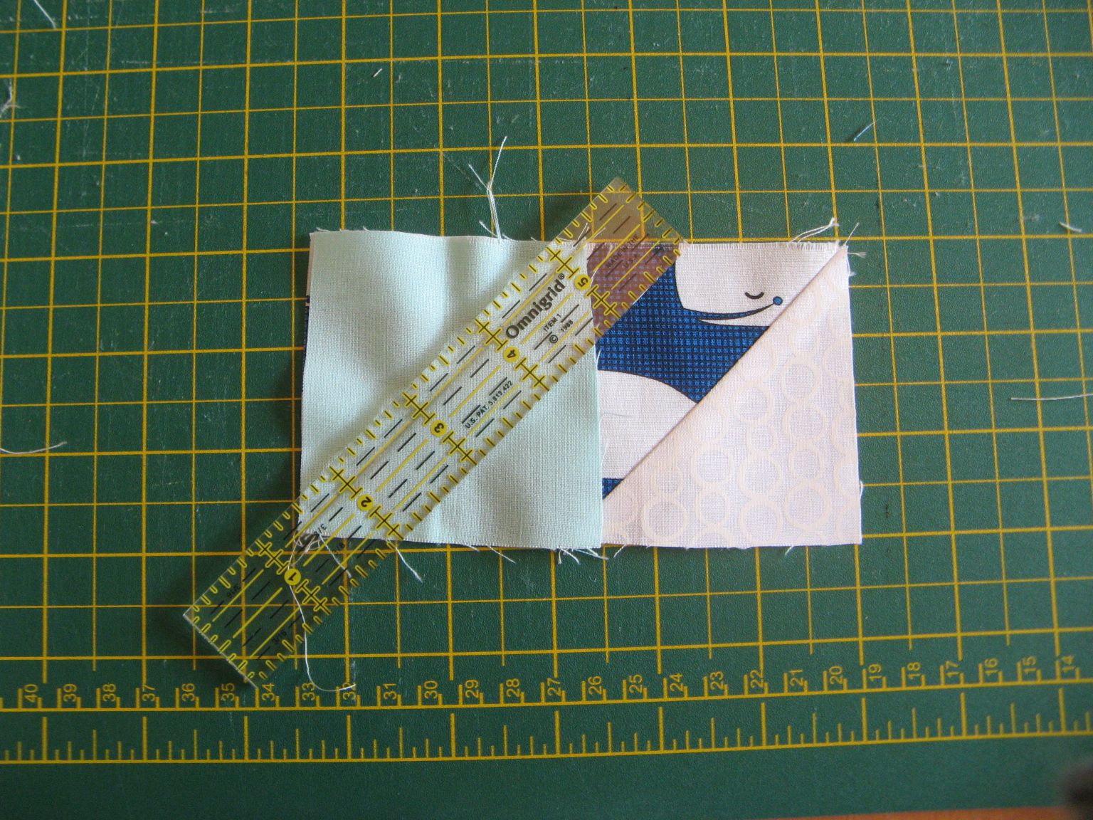 Open up again and trim wastage triangles off (unless you are making Bonus HSTs - see last section of this tutorial). Line up the quarter inch line on your ruler with the stitching line and trim both layers: the square and rectangle fabric below. Press seams open.
