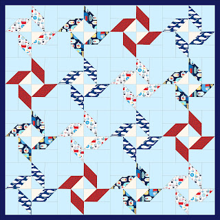 1 FQ each of the four Message in a Bottle prints: Bottles Navy; Red Anchors ; Boats Multi and Navy Whales 1 FQ of white - we used Muslin Mates - Bubbles 1 1/2m of light blue for background - we used Kona Aqua