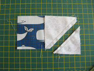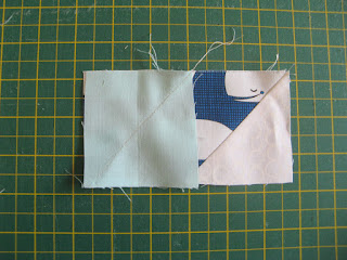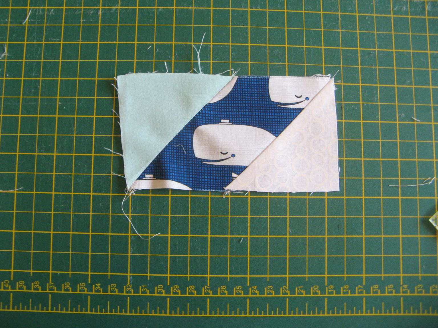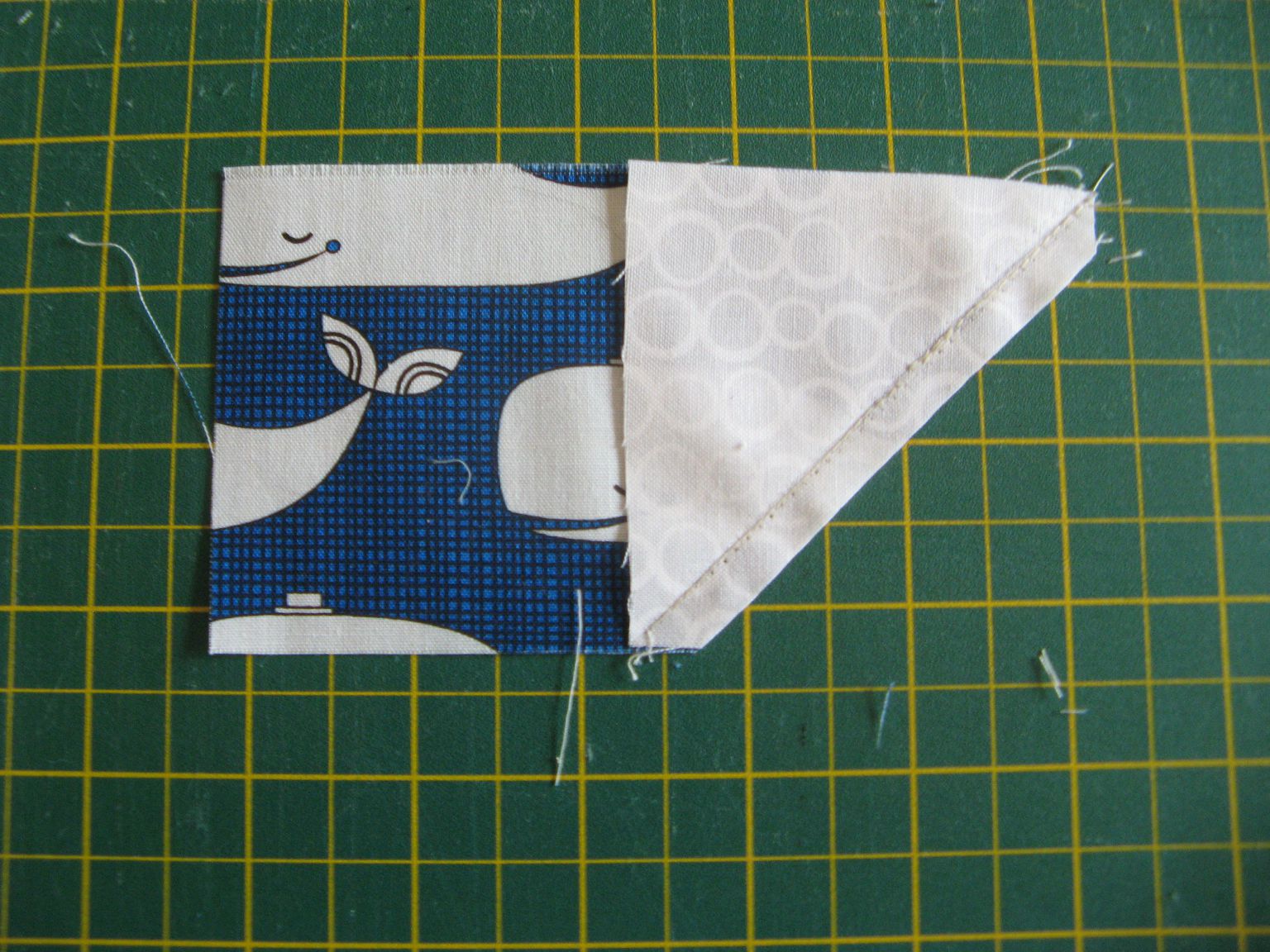 Open up again and trim wastage triangles off (unless you are making Bonus HSTs - see last section of this tutorial). Line up the quarter inch line on your ruler with the stitching line and trim both layers: the square and rectangle fabric below. Press seams open.