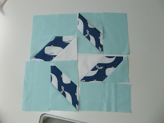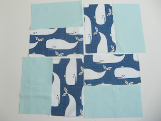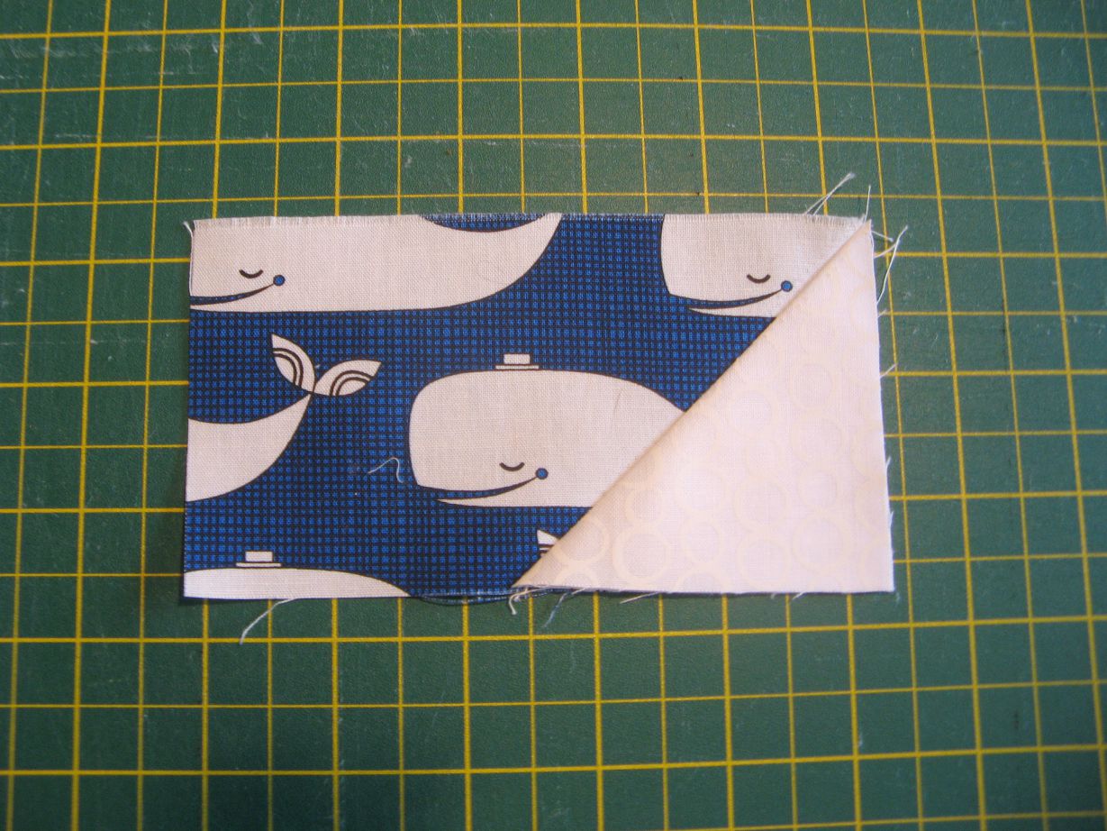 Make one more unit with a white square and feature fabric rectangle; and two more with background coloured squares and your feature fabric rectangles.