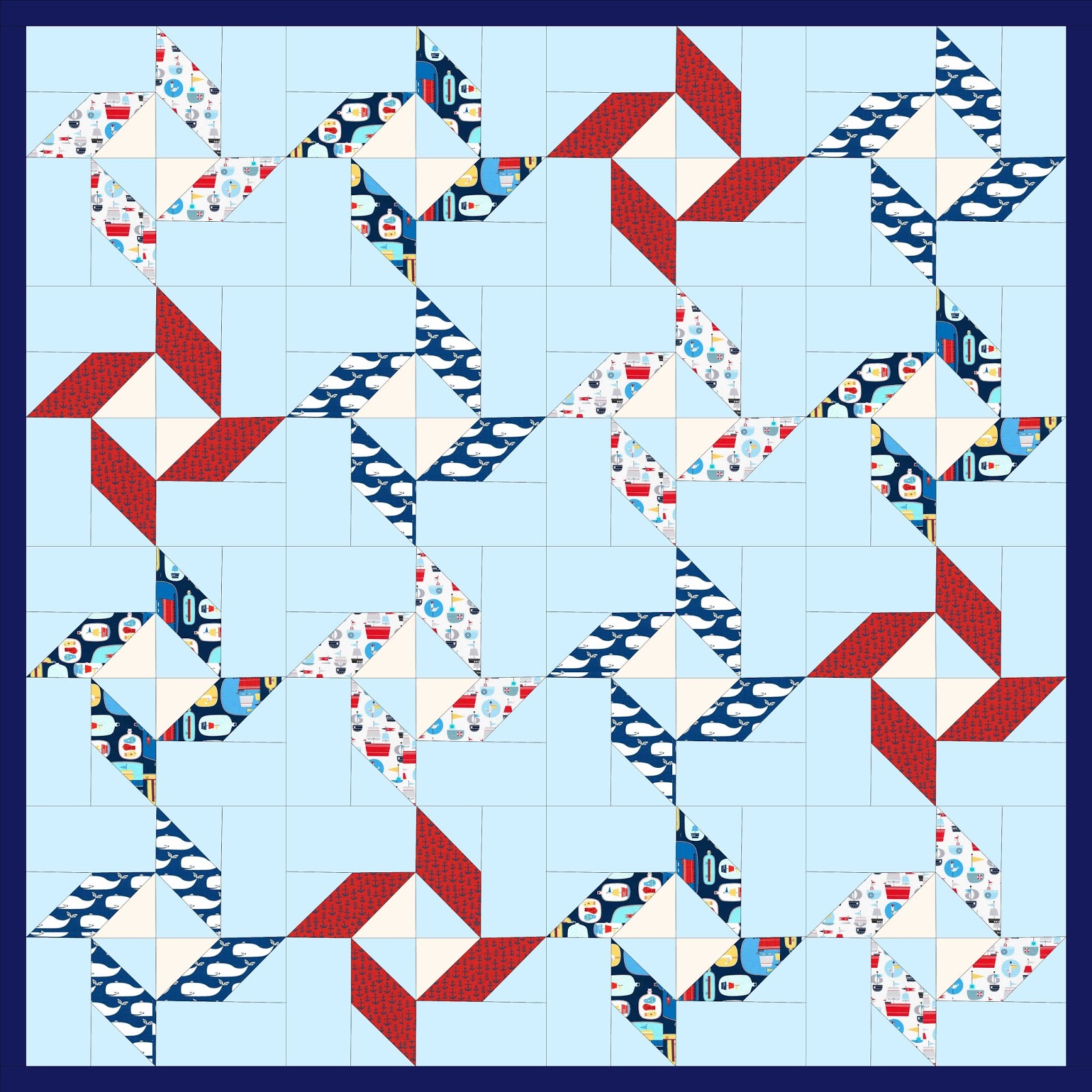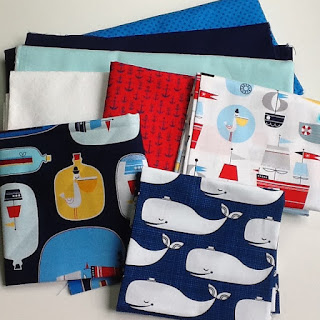 1 FQ each of the four Message in a Bottle prints: Bottles Navy; Red Anchors ; Boats Multi and Navy Whales 1 FQ of white - we used Muslin Mates - Bubbles 1 1/2m of light blue for background - we used Kona Aqua