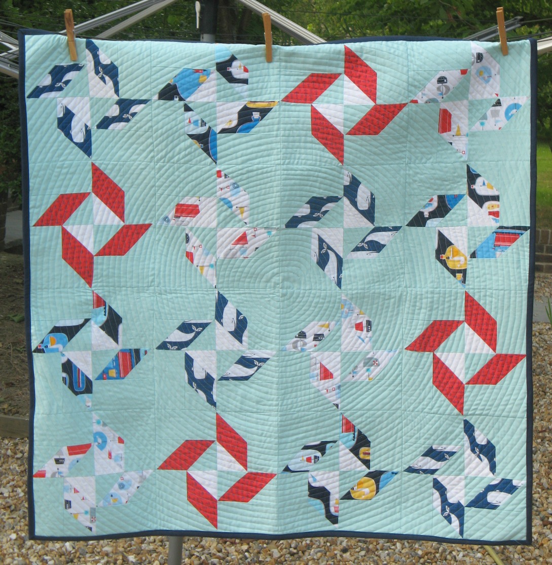 This traditional Flywheel block makes me think of the wheel used to steer a ship or the propeller driving it through the sea, but it could also work for aeroplanes, if baby is destined to be a flyer!
